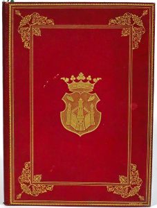 Sous chemise armoriée de l'époque : plein chagrin rouge, armoiries de la ville d'Anvers dorées sur le plat sup. cerné de roul., fleurons et filets dorés, doublures de papier moiré blanc cerné de roul. et filets dorés (griffe sur le plat sup.).