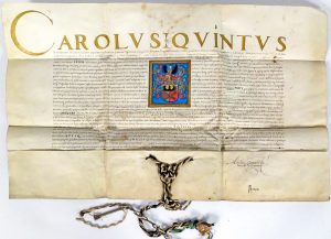 En latin, peau de vélin, 51 x 67 cm, armoiries peintes avec rehauts d'or et d'argent (pliée en 6, cordons de soie et de fil d'or conservés mais sceau appendant manquant, qqs faibles taches).