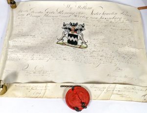 En néerlandais, peau de vélin, 63 x 73 cm, armoiries peintes avec rehauts d'or et d'argent, sceau appendant de cire rouge, enroulé, dans son tube métallique d'origine (sceau brisé avec petits manques).