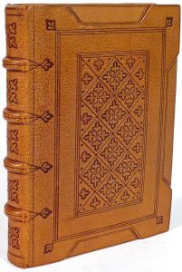 Modern binding : natural pigskin blind stamped with Renaissance-like pattern, beveled boards with a central frame full of fleurons encircled with fillets and with angular fleurons, blind decorated ribbed spine with fillets going on the plates and finishing with fleurons, green edges.