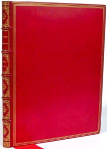 Relié par Thibaron : plein maroquin rouge, plats cernés d'un triple filet doré, dos fleuronné doré à nerfs, filets dorés sur les coupes et remplis, doublures de veau armorié et monogrammé (découpé dans la reliure précédente) cerné d'un triple filet doré, gardes et doubles gardes de papier marbré, tr. dorées sur marbrures assorties aux gardes. Sous étui.