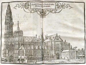 FIRST EDITION (a French edition was published the same year) of this important chorographic essay by Guicciardini (1521-1589), a Florentine merchant who lived in Antwerp. The title, coat-of-arms and portrait of Philipp II are contained in a wood-engraved portico decorated with six allegories. Illustrated with 17 double plates : a copper-engraved general map of the Low Countries and 16 woodcuts (except the plate of the Hôtel de ville of Antwerp), preceded by a title, figuring Antwerp's cathedral, plans, perspective views and maps (Leuven, Brussels, Mechelen, Amsterdam, Mons, Brugge...).
