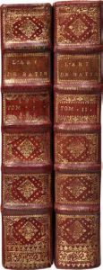 ornés, tranches dorées (reliure de l’époque). ÉDITION ORIGINALE. L’Art de bâtir des maisons de campagne, l’égal du Traité d’architecture dans le goût moderne de Jean-François Blondel. Charles-Étienne Brizeux () est plus connu aujourd’hui pour ses ouvrages que pour les constructions qu’il a laissées. Il est plus un théoricien qu’un architecte. Son Art de bâtir… exerça une certaine influence, qui fut plus notable en province. 260 planches gravées par Moreau, Mutel, de la Marquade et Babel d’après Briseux dont 97 représentent des détails d’ornementations intérieures de style Louis XV qui peuvent parfaitement rivaliser avec celles de Blondel. Elles se composent de frontons, de vases, d’agrafes, de croisées, de lambris sculptés, de cadres de glaces, de couronnements de portes et de niches à lits, de fonds de salons et de pièces de serrurerie. Superbe exemplaire. L’ornementation des caissons de tomaison présente quelques petites différences. Dimensions : 280 x 214 mm. Provenances : timbre humide, Berengere (?) ; Ortiz-Patino (Cat. I, 1998, n° 51). BAL, I, 383 (éd. de 1761) ; Fowler & Baer, 68 ; Katalog Berlin, 2401 ; Millard, I, 41 ; Cohen, 190.