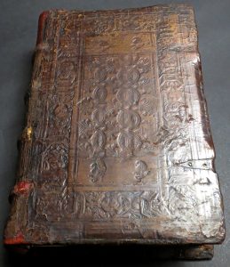 Contemporary binding : calf on wooden boards, blind stamped boards (fillets, characters and vegetal ornaments), ribbed spine (clasps lacking, upper corner of back board damaged, some repairs nicely done, handwritten mention on the upper flyleaf).