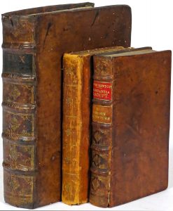 ÉDITIONS ORIGINALES (sauf le 2e). (1). Recueil de 3 traités imprimés à Louvain, plein veau moucheté (lég. bruni, rouss., mouill. marg., us. à la rel.) : (a). Medulla tritici sive Substantia totius S. Scripturae versibus comprehensa. Van Overbeke, 1703, (b). Tractatus de sensibus S. Scripturae et Cabala. Denique, 1704, (c). Alphabetum graecum & hebraicum. Van Overbeke, 1704.-- (2). Dictionarium in quo voces omnes difficilioris significationis, quae in Vulgata nostra S. Scripturae. Vande Velde, 1706, demi-basane (qqs pp. lég. brunies, pet. défauts, us. à la rel.).-- (3). [Texte en hébreu] Lux de luce libri tres, in quorum primo ambiguae locutiones in secundo variae ac dubiae lectiones. Cologne, Friessem, 1710.