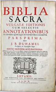 Biblia sacra. Vulgatae editionis cum selectis annotationibus [...]. J.B. Duhamel [...]. Editio secunda accuratissima [...]. Lovanii, apud Martinum Van Overbeke, 1740.