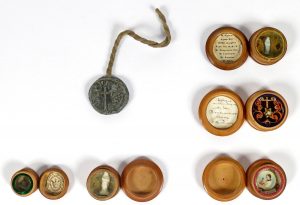 Reliquaire : 5 pièces sous boîtes vitrées en bois blond.