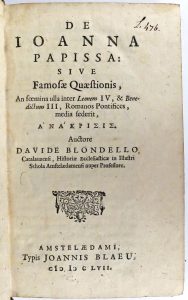 BLONDEL, David.- De Joanna papissa : sive Famosae quaestionis, an foemina ulla inter Leonem IV, & Benedictum III, romanos pontifices, media federit, Anakrisis. Amstelaedami, typis Joannis Blaeu, 1657.