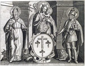 Ouvrage de théologie (éd. orig. en espagnol : 1598; éd. orig. en latin : 1600-1601) du franciscain portugais Rodrígues (1545-1613). Tome IV consacré à des questions juridiques compilé par Paulino Berti. Illustré d'1 in texto figurant la Vierge Marie avec Jésus tenant une crosse d'évêque entourée des saints Norbert et Adrien et avec des armoiries à la devise "Crux arida nutrit". Grandes marques de l'imprimeur sur les titres.