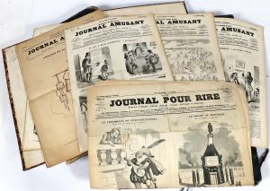 JOINT, mêmes lieu d'éd., éditeur et condition : (1). Journal pour rire, journal amusant [...]. 1856-1877, in-f° demi-percaline brune (mors part. fendus, manque au dos). Num. épars dont 1 non relié.-- (2). Le journal amusant. Journal illustré, journal d'images, journal comique, critique, satirique, etc. N° 679 [- 730], 2 jan. [- 27 nov.] 1869, in-f° demi-veau (déch., sans le num. 625).-- (3). Les physiologies parisiennes. Illustrées par MM. Gavarni, Cham, Daumier, Bertall, Valentin, Adolphe, etc. S.d., in-f° broché ill. de l'ép. (pet. rouss., mors sup. part. fendu, manque au dos, coiffes absentes).
