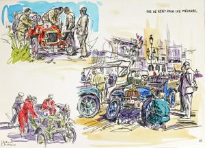 ÉDITION ORIGINALE illustrée par Jacano (i.e. Jacques Hanot, 1932-1995) de 35 pages illustrées dont 10 en couleurs, figurant les diverses automobiles (Oldsmobile, De Dion, Ford, Fiat, Renault, Hispano-Suiza, Rover, etc.) et leurs conducteurs ayant fait le rallye à bord d'"ancêtres"" d'avant 1915. Ce marathon, organisé par "Les Diaboliques" anversois sous le patronage du "Belgian Veteran Car Club", quitta Bruxelles le 23 mai 1961 pour arriver quelques semaines plus tard à Madrid. Tirage à 110 ex., un des 10 de TÊTE sur chiffon de Hollande dont les illustrations ont été aquarellées (lettré J).