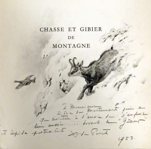 ENRICHI d'un DESSIN ORIGINAL sur le faux titre, crayon gras noir et légers rehauts de couleurs, figurant un bouquetin descendant une montagne enneigée, dédicacé, signé et daté 1953 par l'illustrateur : "à Monsieur [prénom illisible] de Mortemart qui a pu résister à l'envie de s'enfuir lui aussi... devant le "Grand" et rapide portraitiste".