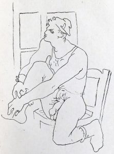 ÉDITION ORIGINALE hors commerce, parue anonymement et illustrée par Jean Cocteau d'un cadre fait de profils cernant le titre (repris en rouge sur papier vert sur le plat sup. de la couv.) et de 29 compositions LIBRES (lithographies ?) au trait noir à pleines pages. Tirage à 525 ex. num., un des 460 sur vélin à la forme (n° 256). L'ouvrage fut édité par Paul Morihien, secrétaire de Cocteau, qui entre 1946 et 1953 publia d'autres livres de Genet mais aussi de Sartre ou Jouhandeau.