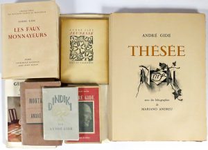 JOINT, de et sur Gide, in-8° ou in-12° br. : (A), de Gide : Dindiki, avec dessins [en couleurs] de Desroches. Liège, Lampe d'Aladdin, 1927. Édit. orig.-- Jeunesse. Neuchâtel et P., Ides et Calendes, 1945.-- Le Retour. Id., id., 1946. Édit. orig.-- Le Traité du Narcisse suivi de La Tentative amoureuse. P., Mermod, 1946.-- Les Faux-Monneyeurs. P., Impr. nationale, Sauret, 1951.-- (B), sur Gide : SACHS, M.- André Gide. P., Denoël & Steele, 1936 (bruni).-- MONTAIGNE, M. de.- Pages choisies par Gide. P., Corrêa, 1939.-- Gide vivant, paroles de Cocteau [...]. P., Amoit-Dumont, 1952.