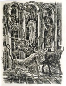 ÉDITION ORIGINALE illustrée de 60 burins en noir (et non 66 comme annoncé à la justification) : plat sup. de la couv. (répété au tome II), titre illustré (idem), 2 frontispices, 6 doubles pages, 50 hors-texte ou compositions à quasi pleine page. Tirage à 575 ex. num., un des 19 de tête (après 1 ex. unique, n° II pour Romain Roels) sur Japon nacré, accompagnés de :