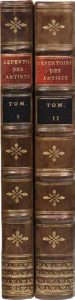 demi-veau, dos à nerfs, tranches rouges (reliure ancienne). Première édition. Un dictionnaire au temps des Lumières, rare et recherché. Il forme une véritable encyclopédie de l’art ornemental des XVIIe et XVIIIe siècles. « Le favorable accueil que le public a daigné faire aux Œuvres d’architecture de Jean Le Pautre, écrit Jombert dans son avertissement, nous engage à lui offrir ce nouveau recueil..., contenant les exemples que nous avons pu rassembler de toutes les parties de l’architecture qui sont susceptibles de décoration... » On y trouve les différentes suites d’architecture, portes, fenêtres, cheminées, de Marot, Mansard, Cottard, Le Pautre ; 3 suites de vases dessinées et gravées par Jean Marot ; les arabesques de Du Cerceau ; de nombreuses décorations intérieures : panneaux, lambris, trophées de Loir, Cotelle, Pierretz ; des suites de bijouteries et orfèvreries de Legaré et Roupert ; des suites d’ornements pour les meubles et les carrosses de Nicolas et Alexis Loir ; des études de têtes et figures anatomiques dessinées et gravées par Abraham Bosse ; La Vie de l’enfant prodigue faite par noble Jacques Callot et mise en lumière par Israël Henriet, son ami, avec la bataille de Rocroy par Chedel ; une suite de dessins de vaisseaux de Perelle pour les peintres d’éventails et de paravents. Guilmard et Cohen se fiant à la table des illustrations indiquent 688 planches ; il en faut en réalité 695. Exemplaire bien complet du nombre de planches requis. Dimensions : 334 x 211 mm. Guilmard, pp. 180-182, n° 62 (« Les deux volumes du Répertoire de Jombert sont très rares. ») ; Foulc, 1914, n° 326 (annonce le bon nombre de pl., 695) ; Cohen, 519 ; Bousquet-Bressolier (C.), « Charles-Antoine Jombert (1712-1784), un libraire entre science et arts », in Bulletin du bibliophile, 1998, I, pp..