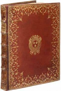 Potain (N. M.). Traité des ordres d’architecture. Première partie. Paris, Ch.-A. Jombert, 1767, in-4°, maroquin rouge, dentelle dorée autour des plats, armes au centre, dos à nerfs orné, tranches dorées (reliure de l’époque).