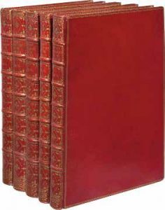 fleurons et roulettes dorés, roulette intérieure dorée, tranches dorées (reliure de l’époque). ÉDITION ORIGINALE et PREMIER TIRAGE de ce grand guide encyclopédique sur le royaume de Naples et de Sicile, alors peu connu, donc peu décrit. Il constitue l’une des plus belles réussites de l’édition française du XVIIIe siècle. La deuxième partie du XVIIIe siècle, prise dans l’élan des encyclopédistes, vit se multiplier les recherches archéologiques, topographiques et géographiques. Témoin de cet engouement, le Voyage pittoresque…, genre qui fut initié par Jean-Benjamin de La Borde (1734-1794), l’auteur de la Description de la France (v. n° 133). Il parvint, en 1776, à convaincre l’abbé de Saint-Non (1727-1791), lui-même influencé par l’esprit éclairé et universel de ses amis encyclopédistes, de s’associer à lui pour la publication d’un ouvrage luxueux, le plus complet possible. Saint-Non était l’homme providentiel : ami et protecteur de nombreux artistes en vue et suffisamment fortuné pour prendre en charge une partie de l’entreprise. Le projet initial devait traiter l’Italie dans son ensemble : devant le gigantisme de l’ouvrage, Saint-Non limita le travail au royaume de Naples et de Sicile. Cette aventure éditoriale le ruina, mais lui valut le titre d’amateur honoraire à l’Académie de peinture. Rédigé entre 1781 et 1786, l’ouvrage relate le voyage entrepris entre 1777 et 1780 par l’équipe dirigée par Dominique Vivant Denon (1747-1802), diplomate et artiste, qui avait été chargé par Saint-Non de rapporter les éléments nécessaires à la rédaction du texte. Les autres participants, tous spécialistes reconnus, étaient : Deodat de Dolomieu, géologue et minéralogiste, à qui l’on doit l’étude sur le Vésuve, référence à l’époque sur le sujet ; Barthélemy Faujas de Saint-Fond, géologue ; Romé de l’Isle, spécialiste d’histoire naturelle ; Châtelet, paysagiste ; Després et Renard, architectes et pensionnaires du roi à l’Académie de Rome. On y trouve ainsi une des premières descriptions des sites d’Herculanum, Pompéi et Paestum, un article sur le tremblement de terre de Messine de 1783, et un état précis des découvertes géologiques de Dolomieu aux îles Lipari. La partie iconographique fut confiée aux tout premiers artistes dessinateurs et graveurs du siècle. Pierre-Adrien Paris, dessinateur et architecte de Louis XVI, Després, Hubert Robert et Fragonard, ont dessiné la plus grande partie des compositions, gravées par Fessard, Saint-Aubin, Choffard, Berthault… Ces illustrations sont de deux sortes : soit des plans et des relevés de sites ou d’objets, soit des vues d’ambiance plus évocatrices pour le lecteur. Le cycle iconographique comprend 5 vignettes de titre, une épître dédicatoire à Marie-Antoinette, 284 planches, 15 vignettes en tête, 96 culs-de-lampe, dont un grand nombre tirés en bistre, 6 cartes, un plan, une planche de phallus et 14 planches de médailles. Superbe exemplaire, bien complet de la planche dite « des phallus » et des 14 planches de médailles des villes de Sicile. Il a appartenu à Armand Albert Rateau, l’un des créateurs les plus novateurs de l’Art déco, qui décora entre autres les magasins et l’hôtel particulier de la célèbre couturière Jeanne Lanvin. Cohen ne relève que 2 exemplaires reliés ainsi, ceux des collections Dutuit et Portalis. Dimensions : 500 x 326 mm. Provenance : A. A. Rateau (1882-1938), avec son ex-libris. Cohen,(« On rejettera la médiocre réimpression de cet ouvrage publiée en 1829. ») ; Ray, The Art of the French Illustrated Book, 1700 to 1914, n° 34 («This is one of the most ambitious and successfull of travel books.») ; Blackmer, Greece and the Levant, n° 1473.