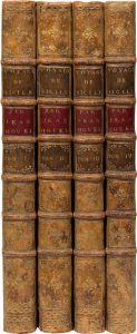 ÉDITION ORIGINALE et PREMIER TIRAGE. Jean Houël (), peintre, dessinateur, graveur et auteur. Ami de Diderot et de Jean-Jacques Rousseau, à l’égal d’Hubert Robert et de Fragonard pour le Voyage pittoresque de Saint-Non, Houël s’inscrit dans le mouvement des védutistes passionnés par l’Italie, ses monuments et ses ruines. Il nous livre ici un reportage entièrement de sa main, texte et illustrations. 264 planches gravées à la manière du lavis par Houël et tirées en sanguine, d’après ses propres dessins réalisés pendant les voyages qu’il fit en Italie et à Malte, de 1776 à 1779. Exemplaire bien conservé intérieurement. Plats très légèrement épidermés. Coiffes usées. Un mors partiellement fendu aux tomes I et III. Dimensions : 498 x 330 mm. Millard, I, 80 ; Cohen, 500 ; […], Hoüel en Italie, Le Louvre, Paris, 1990, p. 17 («  Houël occupe une place tout à fait à part dans l’histoire du paysage européen de la fin du XVIIIe siècle. L’influence des peintres du Nord se fait sentir dans la mise en page toujours claire et ordonnée et l’importance donnée au ciel et aux nuages… »).