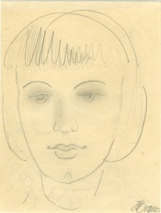 BOQUET (Jean). Sans titre [Portrait de jeune femme]. Croquis à la mine de plomb, signé au coin infér. droit et monté sous passe-partout et cadre doré en bois. Dim. cadre : 29 x 25 cm ; sujet : 17 x 13 cm. Jean Boquet est un peintre et graveur...