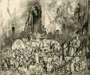 dessinateur, graveur et décorateur, Frank Brangwyn (Bruges, 1867 - Sussex, 1956) travaille pendant quelques années dans l'atelier de William Morris. Il peint des ports, des paysages, des oeuvres religieuses, réalise de nombreuses eaux-fortes, lithographies, illustrations de livres, gravures sur bois, etc. Des voyages au Moyen-Orient, en Russie, au Maroc et en Afrique du Sud ont influencé son oeuvre. En 1936, il offre la plus grande partie de son oeuvre à la ville de Bruges qui la présente au "Musée Brangwyn".