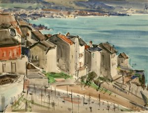 MAFLI (Walter). Sans titre [Paysage côtier]. Aquarelle sur papier, signée au coin infér. droit, montée sous passe-partout et cadre en bois (sans verre). Dim. cadre : 40,5 x 48,5 cm ; sujet : 26 x 33 cm.