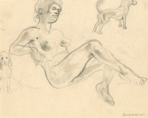 RASSENFOSSE (Armand). Sans titre [Nu aux chiens]. Crayon gras sur papier, signé au coin infér. droit. Croquis au crayon gras également au verso. Dim. support et sujet : 17 x 20,5 cm.