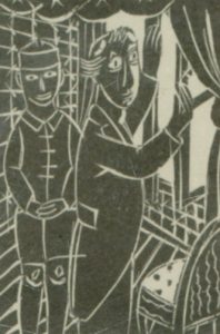 TYTGAT (Edgard). "Les Deux Amis devant la fenêtre" (1927). Bois en noir monté sous cadre en bois. Dim. cadre : 32,5 x 25,5 cm ; sujet : 8,9 x 6,4 cm (Taillaert, 54).