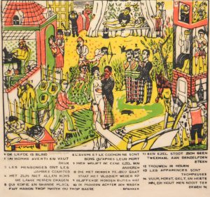 TYTGAT (Edgard). "Proverbes flamands" (1934). Bois en couleurs, monté sous passe-partout et cadre doré en bois. Retirage par la Chalcographie de la Bibliothèque royale de Belgique. Signature apocryphe. Dim. cadre : 62 x 62 cm ; sujet : 40 x 40 cm...