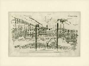 WOUTERS (Rik). "Village sous la neige" (1911). Eau-forte en noir tirée sur papier vélin, datée, signée dans la planche et montée sous passe-partout et cadre noir en bois. Retirage. Dim. cadre : 31,5 x 42 cm ; sujet : 11,8 x 17,9 cm (Avermaete, 2...