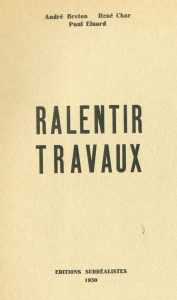ARAGON (Louis), BRETON (André) et ELUARD (Paul). Ralentir travaux. [Paris], Edit. surréalistes, 1930, 4°, non paginé, br., couv. imprimée rempliée (très lég. brunie). Edit. orig. tirée à 300 ex. num. 1/250 Lafuma-Navarre. Bel ex.