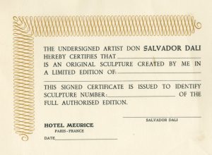 DALI (Salvador). Certificat d'authenticité (vierge !) pour "an original sculpture created by me in a limited edition". 1 f. de 14 x 19 cm, imprimé en noir et or. A compléter à votre guise...