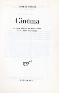 DESNOS (Robert). Cinéma. Textes réunis et présentés par A. Tchernia. P., Gallimard, 1966, 8°, ill. hors texte, br., non coupé. Edit. orig. 1/31 ex. num. sur vélin pur fil, seul grand papier.
