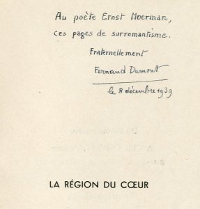 DUMONT (Fernand). La Région du coeur. Mons, Éditions du Groupe Surréaliste en Hainaut, 1939, in-18, 72 p., br., couv. illustrée (défraîchie). Edit. orig. 1/200 ex. num. sur Hélio. Bel envoi : "Au poète Ernst Moerman, ces pages de...