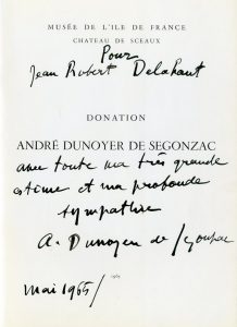 souvenir. A. Dunoyer de Segonzac. Sept. 1967"./ Donation André Dunoyer de Segonzac. Châteaux de Sceaux, 1965, gd 8°, non paginé, ill., br. Envoi "Pour Jean Robert Delahaut, avec toute ma très grande estime et ma profonde sympathie. A. Dunoyer de Segonzac, mai 1965"./ Dunoyer de Segonzac. Dessins, 1900-1970. Genève, Pierre Cailler, 1970, 4°, 450 p., nombr. ill., rel. édit., jaq. (1 coin écrasé). Envoi : "Pour J.R. Delahaut ces 'Dessins' et croquis, en très cordial et sympathique hommage. A. Dunoyer de Segonzac, septembre 1970"./ ROGER-MARX (Claude). Dunoyer de Segonzac. Même édit., 1951, 4°, 118 p., 159 pl. hors texte, cart. édit., taches noires au 1er et dern. f./ FOUCHET (M.-P.). A. Dunoyer de Segonzac, Saint-Tropez et la Provence. P., A. Morancé, 1964, in-folio, ill. noir et coul., en feuilles, farde édit. Tiré à 1000 ex. num. (sans la planche annoncée). Envoi "Pour Jean Robert Delahaut en très amical hommage et en très vive et cordiale sympathie. A. Dunoyer de Segonzac, janvier 1965"./ Ensemble de photos des illustrations des Georgiques illustrées par Dunoyer de Segonzac. Ces photos ont été prises par les ateliers Ciccione à Paris et Maurice Poplin à Villemonble (cachets au verso + mentions manuscrites)./ Ens. 6 pièces.