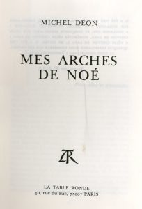 DEON (Michel). Mes arches de Noé. Paris, La Table Ronde, 1978, 8°, 281 p., br., couv. rempliée, non coupé (petit pli d'origine aux premiers f., bords de la couv. très lég. brunis, petite déchir. au bas du mors arrière). Édition originale....