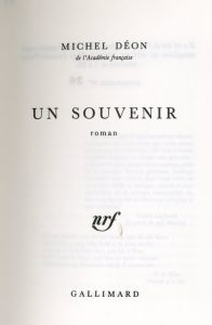 DEON (Michel). Un souvenir. Roman. Paris, Gallimard, 1990, 8°, 151 p., br., couv. à rabats, non coupé. Édition originale. 1/80 sur vélin pur chiffon de Rives, seul grand papier. État neuf (Lebrun, 90).