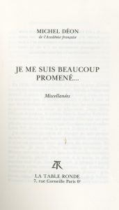 DEON (Michel). Je me suis beaucoup promené... Miscellanées. Paris, La Table Ronde, 1995, 8°, 233 p., br., non coupé. Édition originale. 1/60 ex. num. sur vélin de Lana, seul grand papier. État neuf (Lebrun, 96).