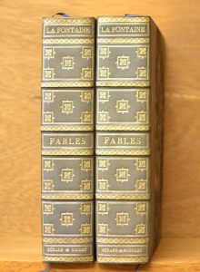 COCHET.- LA FONTAINE. Fables. Avec 237 pointes sèches de Gérard Cochet. P., [J.-G. Daragnès], 1950, 2 fort vol. 4°, demi-maroquin gris à coins, dos à 4 nerfs dorés, auteur, titre, illustrateur et caissons fleuronnés dorés, couv. et dos...