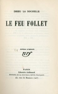 DRIEU LA ROCHELLE (Pierre). Le Feu follet. P., NRF, 1931, in-12, 213 p., br. (dos bruni et fendillé en queue de dos). Edit. orig. tirée à 756 ex. num. 1/647 vélin Lafuma.