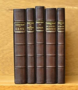 Reliures de Peeters.- HAMP (Pierre). Gens. Le Rail. La Victoire mécanicienne. Un nouvel honneur. Les Chercheurs d'or. P., Nouvelle Revue Française, 1912-1923, 5 vol. 4° tellière, demi-chagrin brun poli à coins, dos à 5 nerfs, titre doré dans...