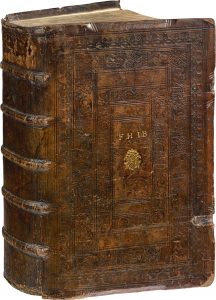 Belle reliure en veau estampé au chiffre et aux armes de Ferdinand de Bavière (1577-1650), qui l'a offert à un ecclésiastique en 1591, avec mention manuscrite sur une garde.Ex-libris manuscrit du couvent de Ratisbonne sur le titre.Manques de peau sur la coiffe inférieure et les coins ; trois fermoirs manquent, le quatrième est détaché.VD16 : W3004-W3005 – Rabenau : Deutsche Bucheinbände der Renaissance, n°24.