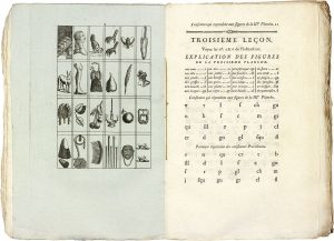 Cinquième édition, refondue par M. Alexandre, ornée de 4 planches de figures gravées sur cuivre, tirées sur papier vert d'eau et collées en fond de cahiers.La première édition de cette méthode d'apprentissage de la lecture est de 1743.Quérard, I, 301.