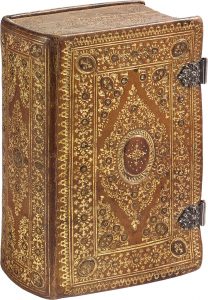 Matthieu Berjon, 1605. 2 parties en un volume in-8, maroquin citron, large bordure de dentelle, filets et petits fers dorés, rectangle central orné d'un grand losanges et d'écoinçons de feuillage doré, le tout orné de fleurons dorés dans des ovales de maroquin fauve mosaïqués, dos lisse orné de même, tranches dorées et ciselées avec rehauts de brun, fermoirs de métal ciselé (Reliure de l'époque).