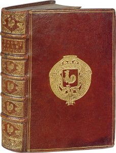 centre, dos orné d'un coq héraldique répété, roulette sur les coupes, roulette intérieure, tranches dorées sur marbrure (Reliure de l'époque).