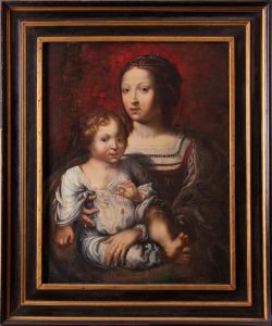 Huile sur panneau de bois, 46 x 35,5. Dans un cadre brun à filets dorés. Peintre né à Maubeuge (d’où son surnom de Mabuse) en 1478 et mort vers 1536 à Anvers. Il semble qu’il acheva sa formation artistique à Anvers où il fut reçu franc-maître en 1503. Disciple des grands primitifs, il voyagea en Italie. Il voyagea beaucoup, se mettant au service des princes et des puissants (Bénézit). La présente œuvre existe en différentes versions, de la main du maître, ou provenant de son studio. Des éléments importants varient de l’une à l’autre, comme les visages. Notre exemplaire présente des restaurations, retouches et repeints généralement périphériques.