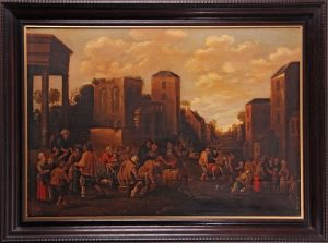 Huile sur panneau de bois, 59 x 83. Pièce en belle condition (on remarque une restauration du panneau fendu dans son tiers inférieur, à 11 cm du bord, et réparé au dos). Dans un cadre noir. Evocation des Sept œuvres de miséricorde (Saint Matthieu, XXV, 35-36) : «Car j’ai eu faim et vous m’avez donné à manger, j’ai eu soif et vous m’avez donné à boire, j’étais étranger et vous m’avez accueilli»… L’original du tableau est conservé en France, au musée de la Lunette, à Morez. Joost Cornelisz Droochsloot (ou Droogsloot) serait né à Utrecht en 1586, et est mort dans cette ville en 1666, où il fut maître en 1616, et doyen en 1623 et 1644 (Bénézit). Il appartient à l’école hollandaise ou flamande.