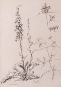 Deux dessins à la plume, sur papier vélin 35 x 25. Le premier titré «Digitalis purpurea. Scrophularinées» et signé et daté «Fcois Maréchal. 14 juillet 1897» (une troisième plante, à gauche, est datée «21 août 1897». Le second, représentant deux plantes,signé et daté «Fcois Maréchal. 25 juin 1897». En très belle condition. Sous verre et passe-partout, cadres de bois naturel.
