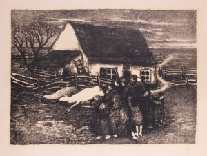 Lithographie, 70 x 86. Signée «W D de N» et datée? «14» au crayon en bas à droite. Quelques traces de manipulations aux marges, sinon en belle condition. Joint : W. DEGOUVE de NUNCQUES. Sans titre. 2 lithographies, 70 x 86 et 50 x 68 (une avec marges et l’autre sans), sujet identique. Scène paysanne. Celle avec marges, signée «W D de N» et datée? «16» au crayon en dessous. Traces de manipulation dans les marges.