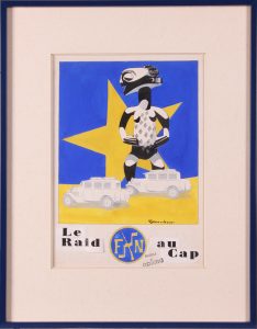 Aquarelle, 26 x 18,5. Signée «A. Mambour» en bas à droite. Projet d’affiche réalisé parallèlement à l’affiche publiée chez Bénard. Texte imprimé dans une police de caractères similaire à celle de l’affiche publiée (en dessous, crayonné d’un autre texte). Le sigle FN aquarellé. Un fétiche africain surplombe les deux voitures du raid sur un fond bleu soutenu(du même ton que celui du sigle), sur lequel se détache, en jaune vif, une grande étoile et le bas de l’affiche. Un cachet «Publi-Optima», (l’agence de création publicitaire créée par Mambour en 1928) a été apposé au bas de l’affiche. Non retenu pour l’affiche définitive, ce projet présente cependant une force et un dynamisme certains. Sous verre et passe-partout, dans un cadre aluminium bleu foncé. Pièce en très belle condition.